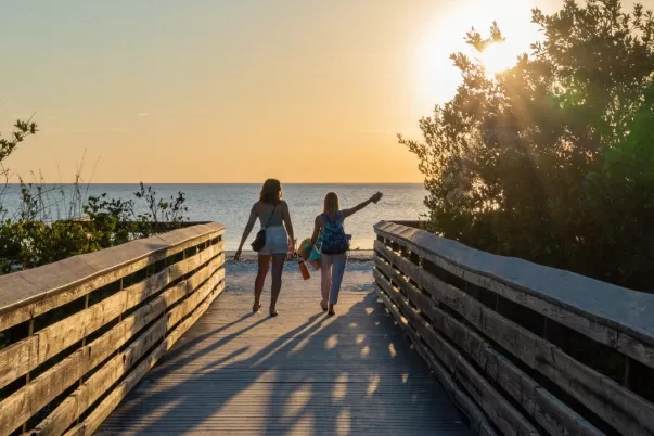 At the base of the bridge, Times Square is filled with lively crowds and endless entertainment. Pop into a beach bar for live music and drinks, wander between food truck favorites, and watch street performers in action. Sunset is an especially spectacular time to gather, with clear views from the beach to see the sun sinking into the Gulf waters. Dine on the patio at Nervous Nellie's on a Sunday night and you'll be treated to a free concert at adjacent Bayside Park.